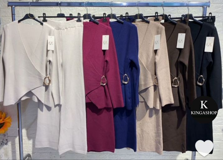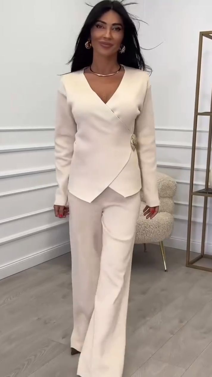 Refined and comfortable, this knit set is perfect for any occasion. The set consists of a cardigan with an asymmetrical closure and a jewel ring detail, paired with soft high-waisted pants. Made from stretchy and warm fabric, it offers a comfortable and feminine fit.