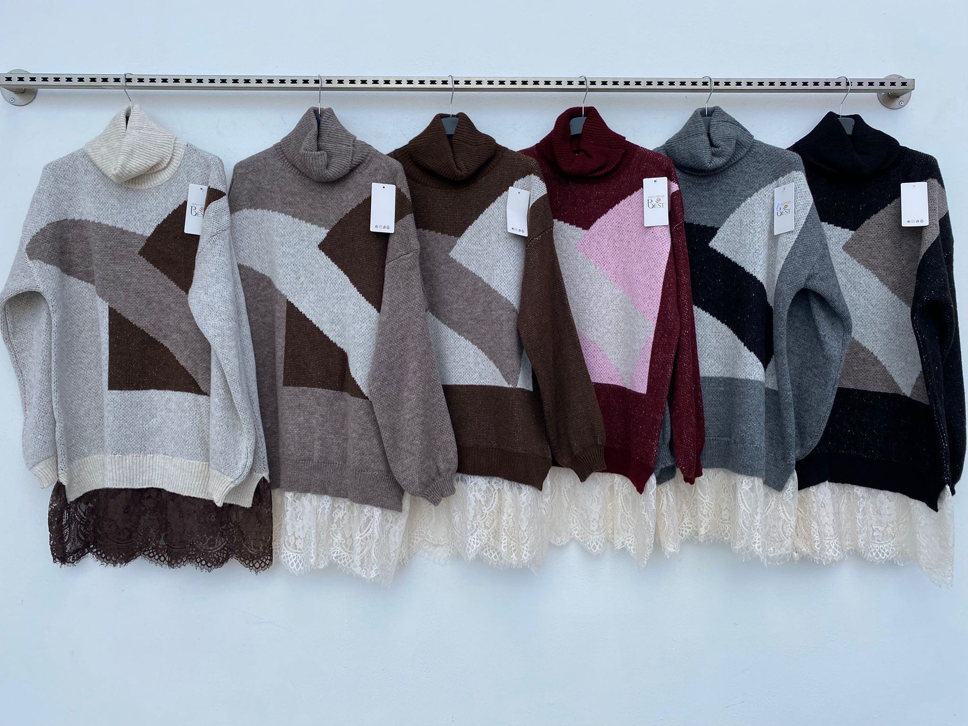The lower part is enriched with a delicate and romantic ruffled lace skirt, creating a charming contrast with the structured knit. Perfect to wear with boots or heels for a chic and contemporary look, ideal for both day and evening.