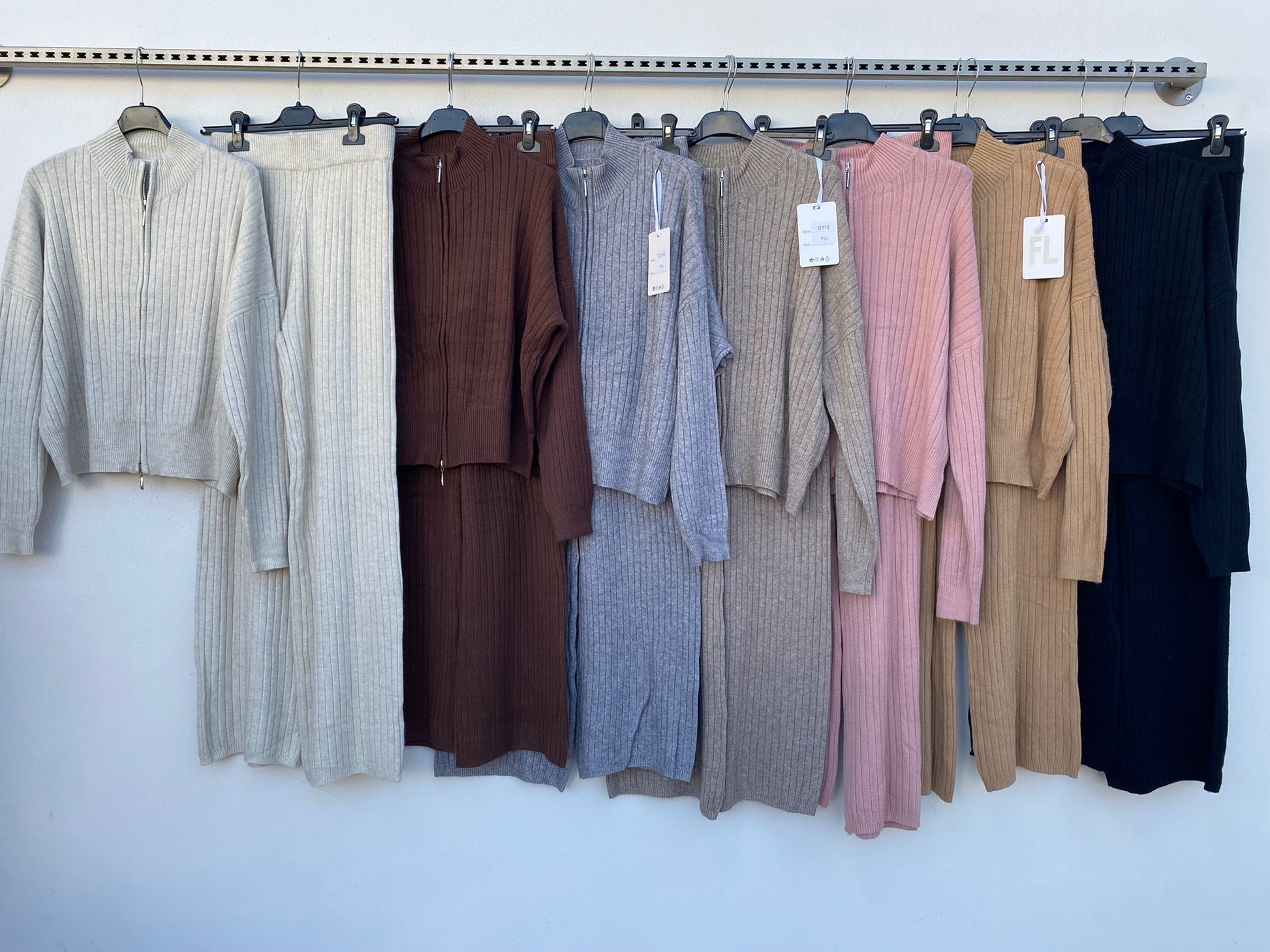 This ribbed knit set is perfect for the autumn and winter seasons. The set includes a cardigan with a front zip and wide-leg pants, both made from a soft and comfortable fabric that wraps the silhouette without being tight.