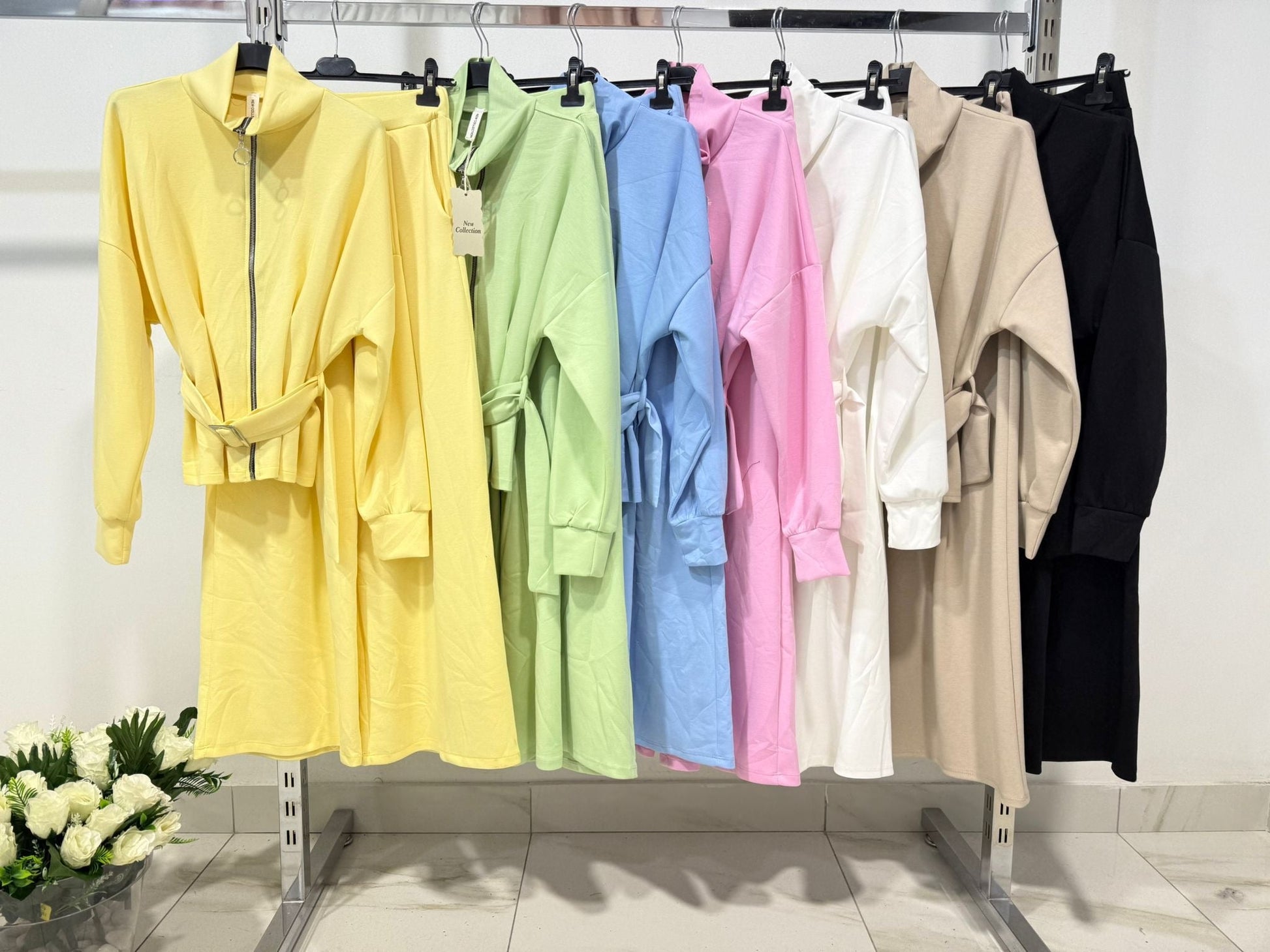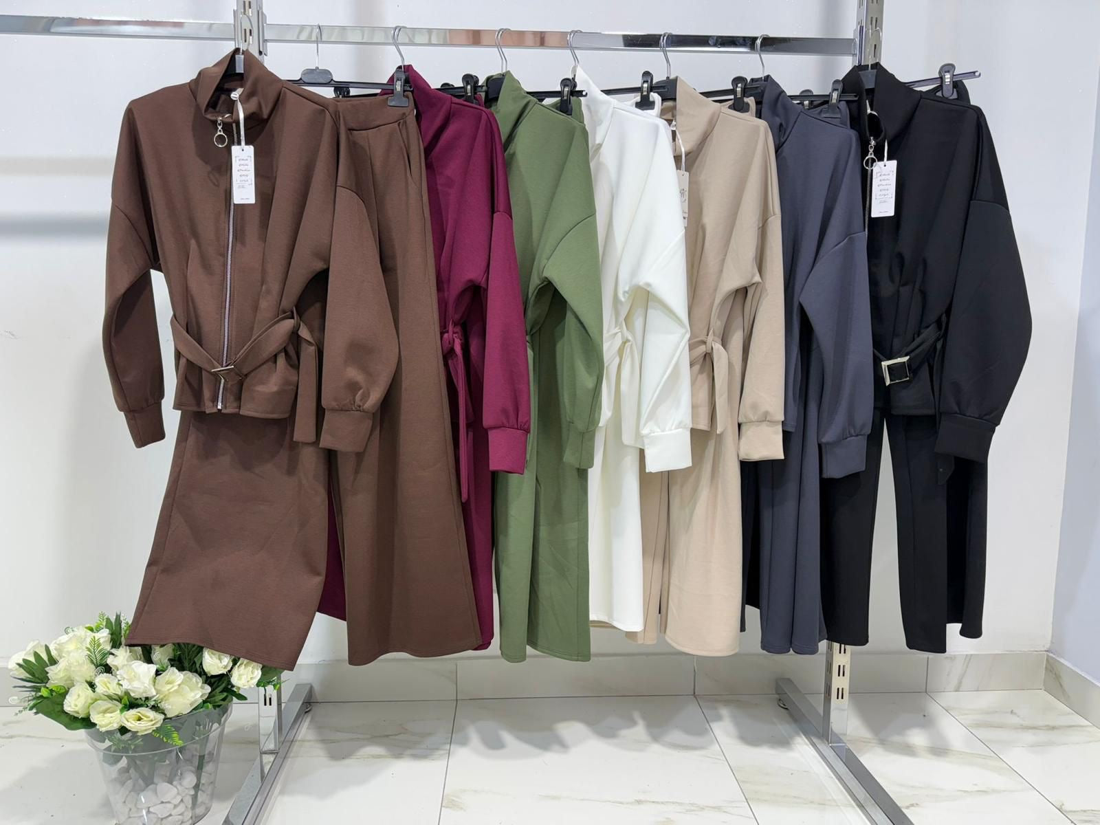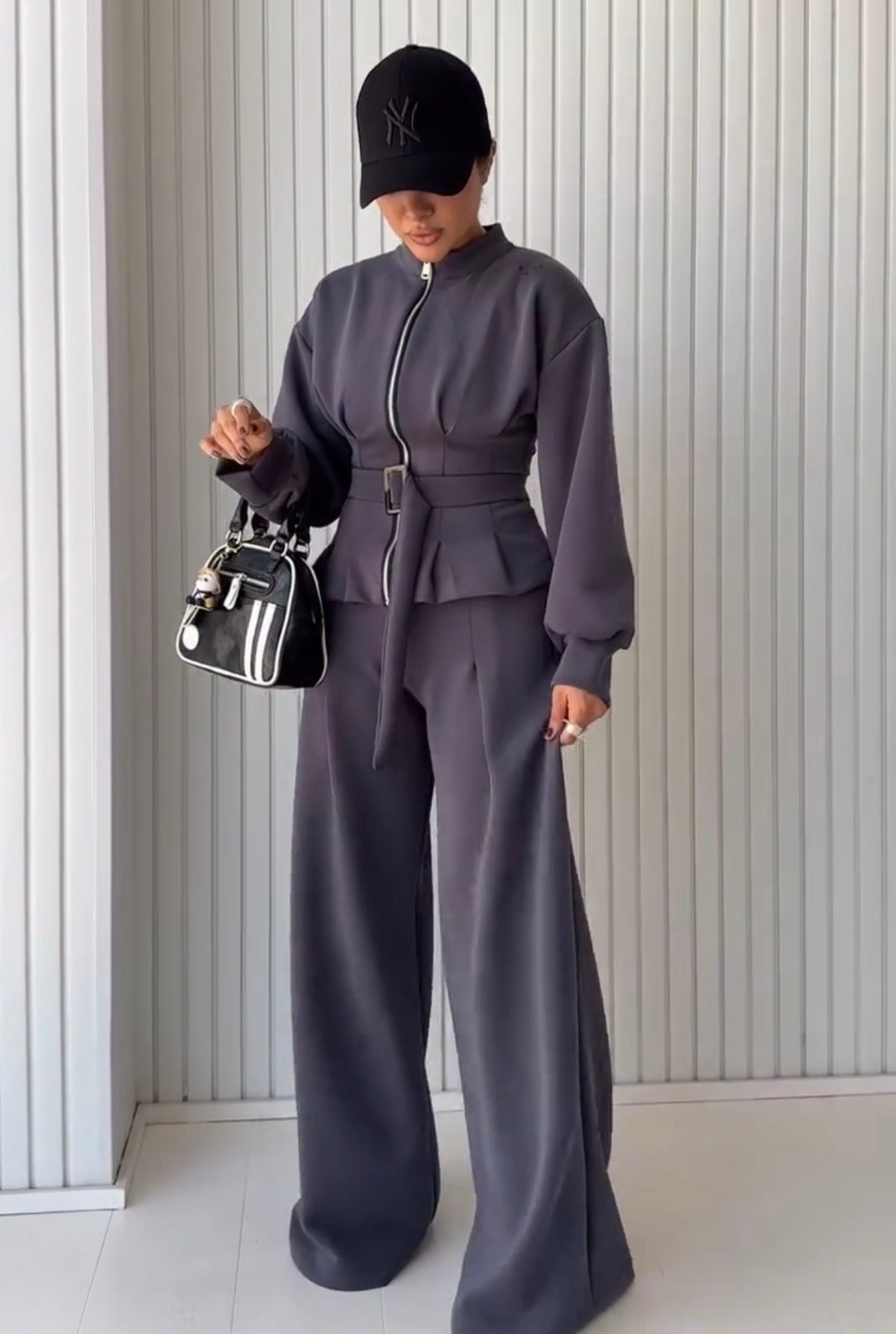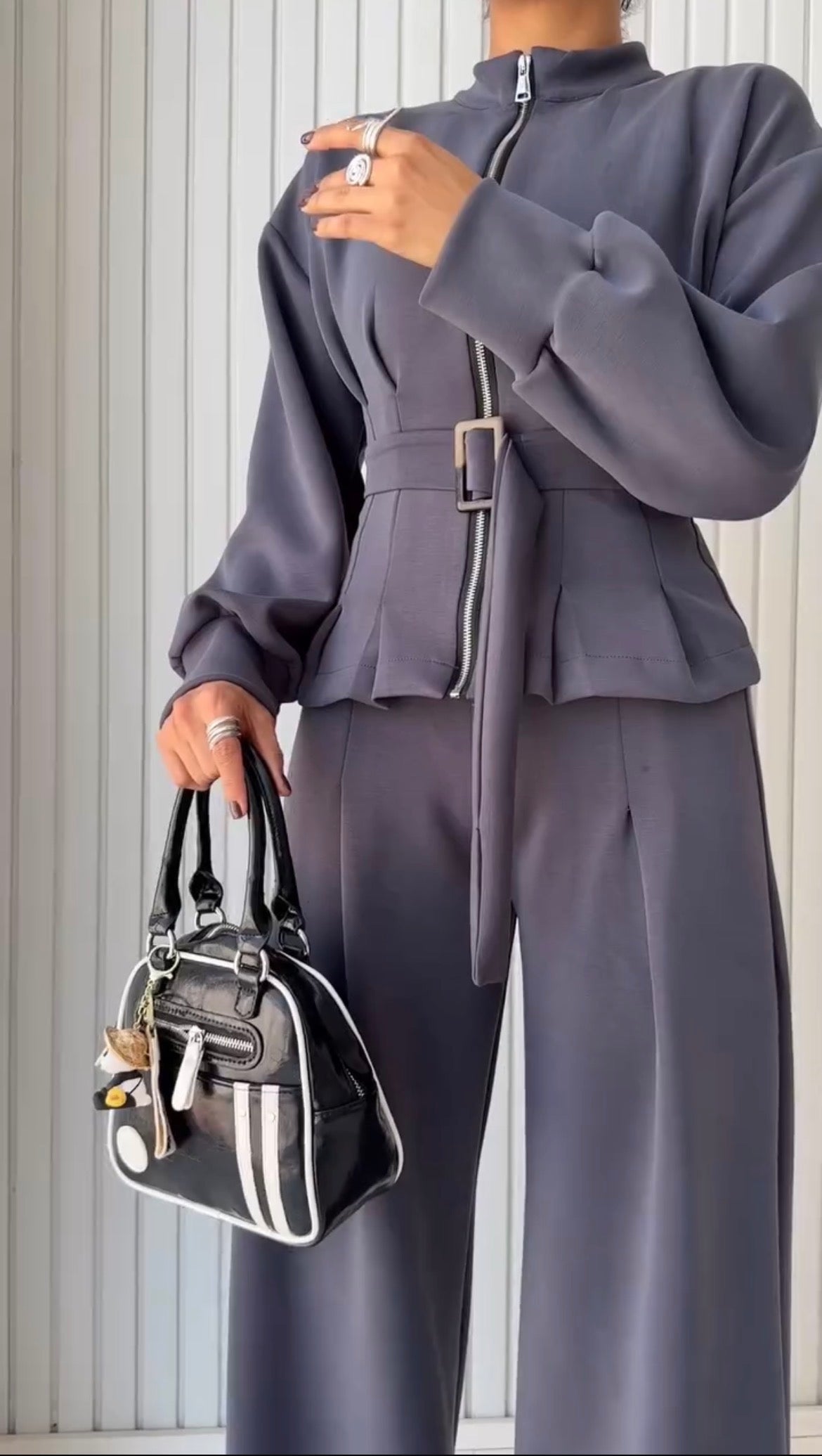 An essential and refined look: trousers with a clean cut paired with a long top, completed by a waist belt that naturally enhances the shapes with elegance.